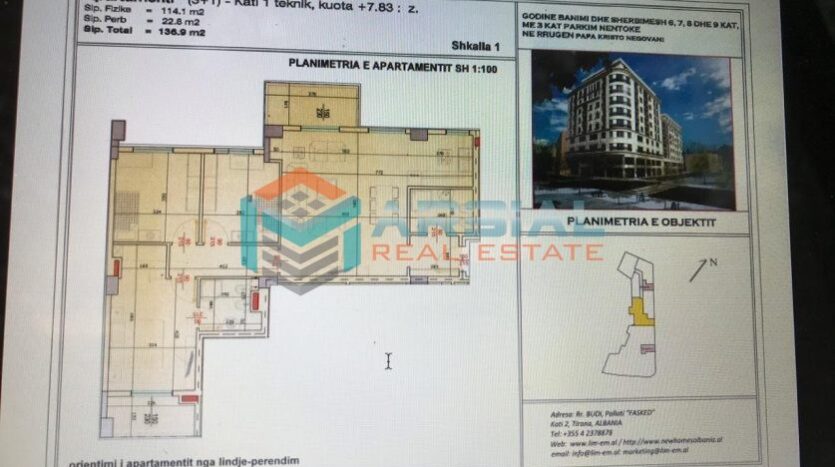 Shitet apartament 2+1 me siperfaqe 102,36m2 ne katin e trete te nje pallati te ndertuar ne vitin 1996. Apartamenti eshte i organizuar ne nje sallon me ...